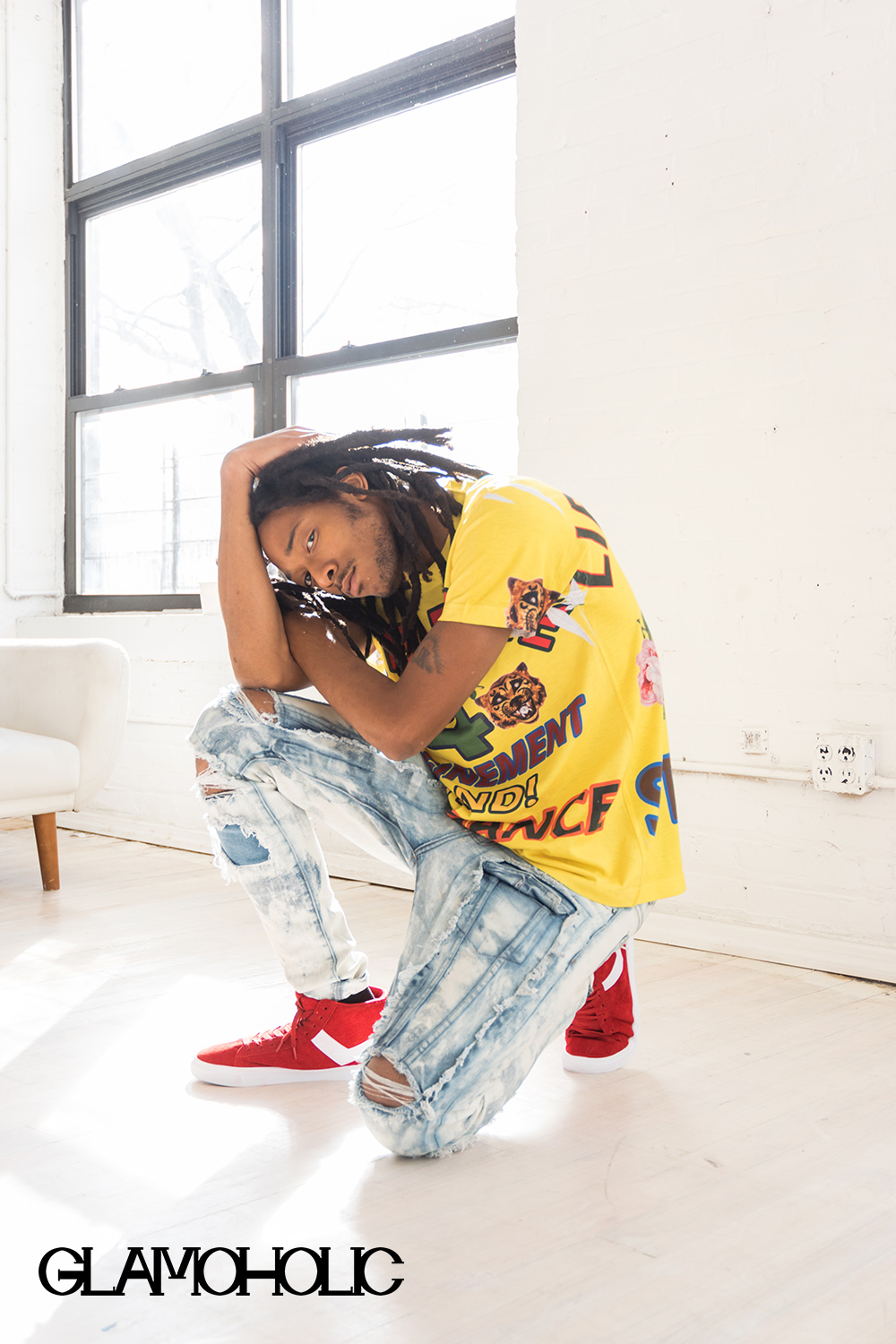 Graphic print t-shirt by Libertine by Johnson Hartig (Spring 2020); customized distressed jeans by Embellish NYC; ring, Cezur III’s own; red sneakers by PONY | ||||||||