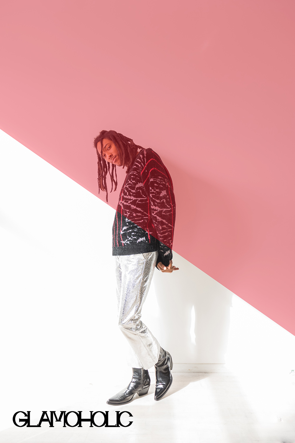 Graphic print sweater by Angel Chen (FW2020); metallic reflective leather pants by Collini Milano 1937 (SS2021); ring, Cezur III’s own; vintage boots by Calvin Klein