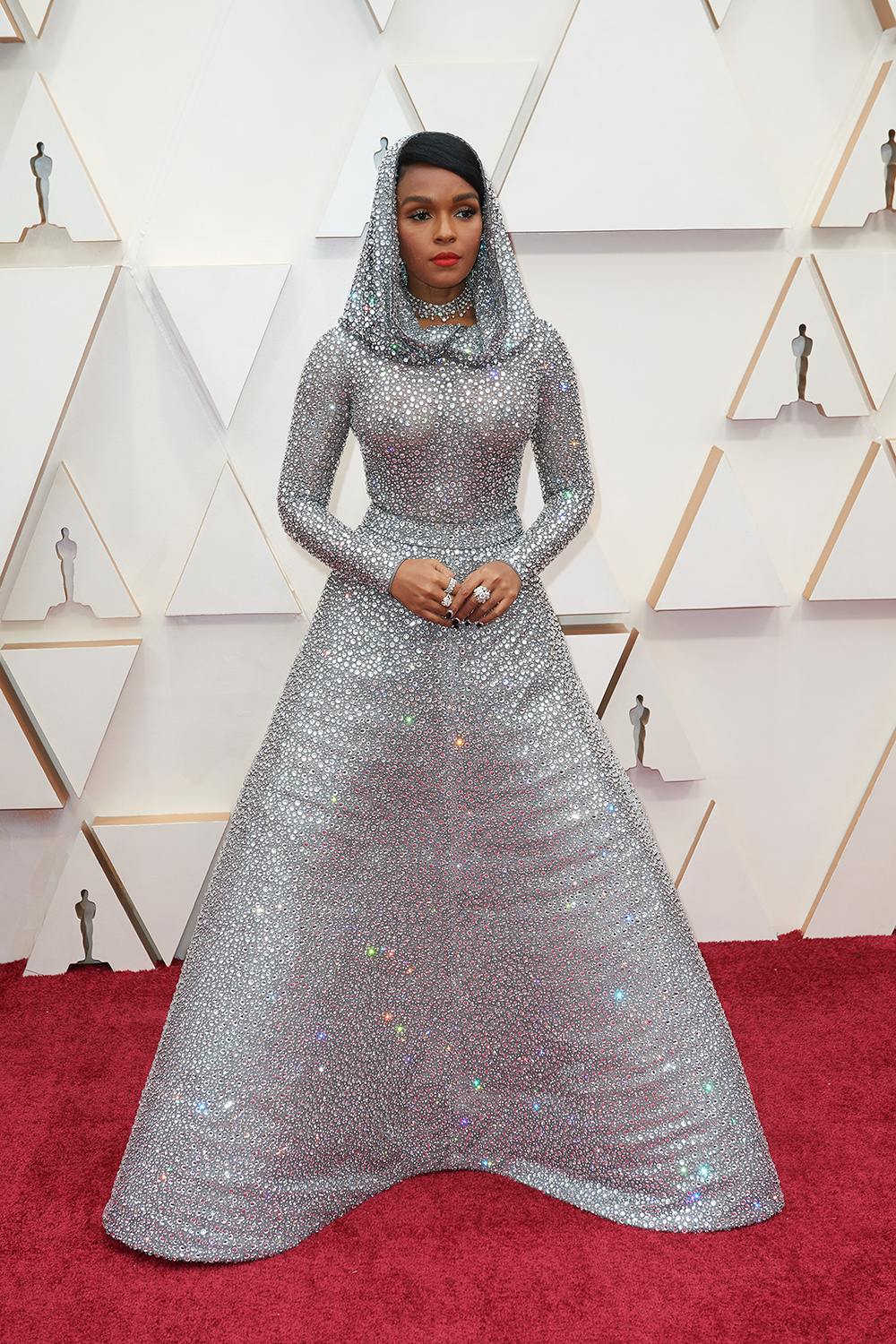 Performer Janelle Monáe made a red-carpet moment wearing a custom Ralph Lauren gown studded with dégradé crystals — from the dramatic, draped hood and open portrait back to the sculptural skirt in lacquered silk lamé. "SPECIAL THANK YOU TO THE ARTISANS who put in 600 hours of expert hand-embroidery to adorn 168,000 crystals over lacquered silk lamé tulle." Janelle captioned an Instagram post.